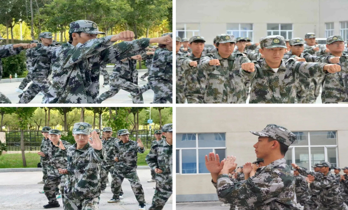 擒敌拳演练成为训练场上的“亮点环节”。新生们出拳迅猛如雷、踢腿凌厉似风,每一招每一式都透着股不服输的狠劲,刚劲有力的动作在烈日下交织成热血画面。响亮的口号响彻云霄,不仅展现出新时代大学生的蓬勃朝气,更传递出他们勇于挑战、敢于拼搏的精神风貌。