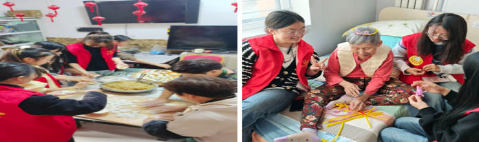 活动当天,工作人员对志愿者们进行了服务知识的专业培训。随后,志愿者们耐心地陪伴老人们聊天,并为老人们带来了精彩的才艺表演。最后,志愿者们与老人们共同包制饺子,并手把手教导他们使用扭扭棒制作可爱的小摆件。