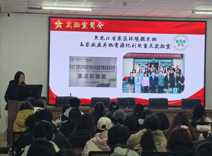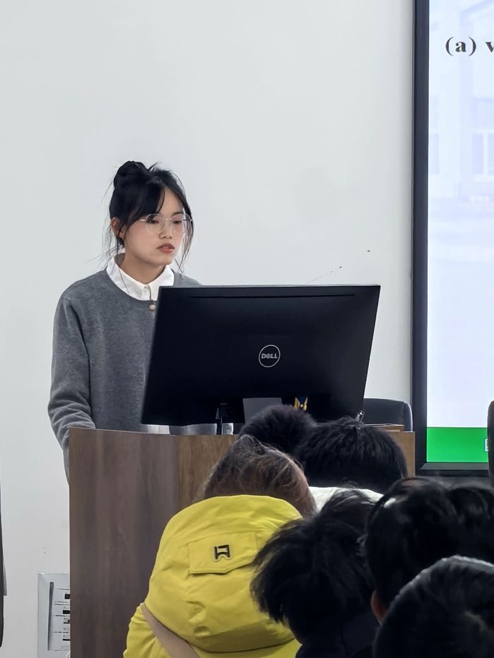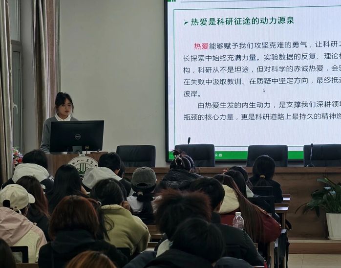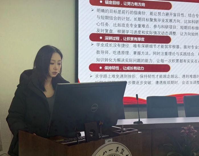 第一个进行分享的是何恬田,生物学专业2024级硕士研究生。研究方向为生物修复石油污染技术。在Applied Surface Science期刊发表SCI论文一篇。第一作者发表中文文章1篇,申请发明专利1项,授权发明专利2项,授权软件著作权1项,参加了多次学术会议。她用她的经验向学弟学妹们分享了要筑牢学科的理论基础,以对科研的热爱驱动自己攻克难题,同时坚持持续学习、深度研读文献,把握学科前沿以推动科研创新。